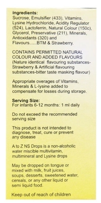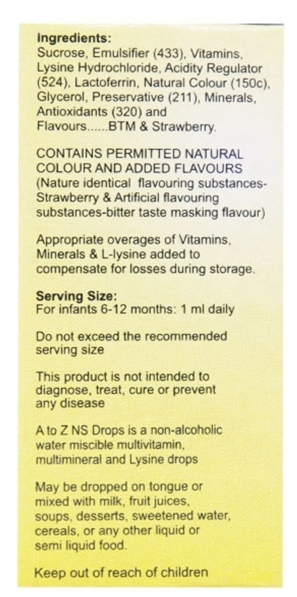 A to Z NS Oral Drops is a multivitamin, multimineral and lysine oral drops for infants that help to enhance immune function and boost energy levels. It contains amino acids that help with various body functions.