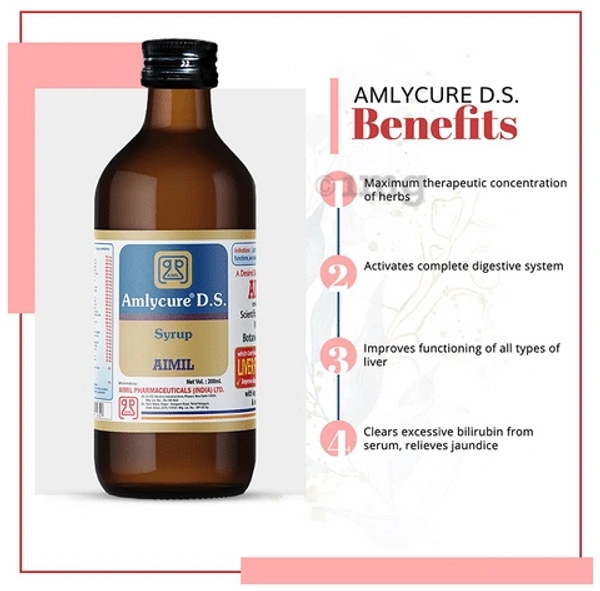 Aimil Amlycure DS सिरप एक लीवर-सुधारात्मक और सुरक्षात्मक सिरप है जिसमें पॉली-हर्बल घटक होते हैं जो विभिन्न कारणों से लीवर को बीमारियों और विकारों से बचाने में मदद कर सकते हैं। इसमें कालमेघ, कुटकी, गिलोय, तुलसी, शरपुंखा आदि जैसी कई शक्तिशाली जड़ी-बूटियां शामिल हैं, जो एलएफटी मापदंडों की सामान्य स्थिति को बहाल कर सकती हैं और अशांत सेलुलर अखंडता को बढ़ा सकती हैं। उपयोग के दौरान चिकित्सीय प्रभाव प्रदान करने के लिए सिरप इष्टतम एकाग्रता में सहक्रियात्मक रूप से अभिनय करने वाले हर्बल अर्क की उच्चतम संख्या से समृद्ध है। यह लीवर को टोन करने के लिए भूख, पाचन, आत्मसात और चयापचय के लिए संपूर्ण पाचन तंत्र को सक्रिय करता है। यह रोग प्रतिरोधक क्षमता को बढ़ाने में भी मदद करता है।