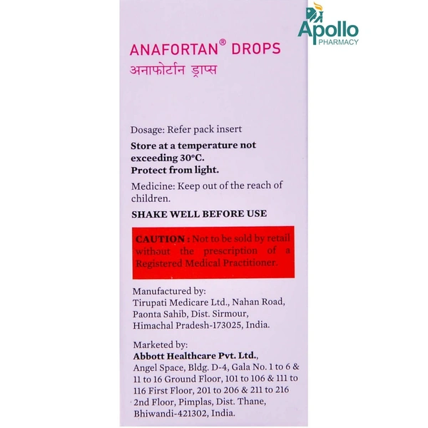 Take this medicine in the dose and duration as advised by your doctor. Check the label for directions before use. Measure it with a marked dropper and take it as directed. Anafortan Drop may be taken with or without food, but it is better to take it at a fixed time.