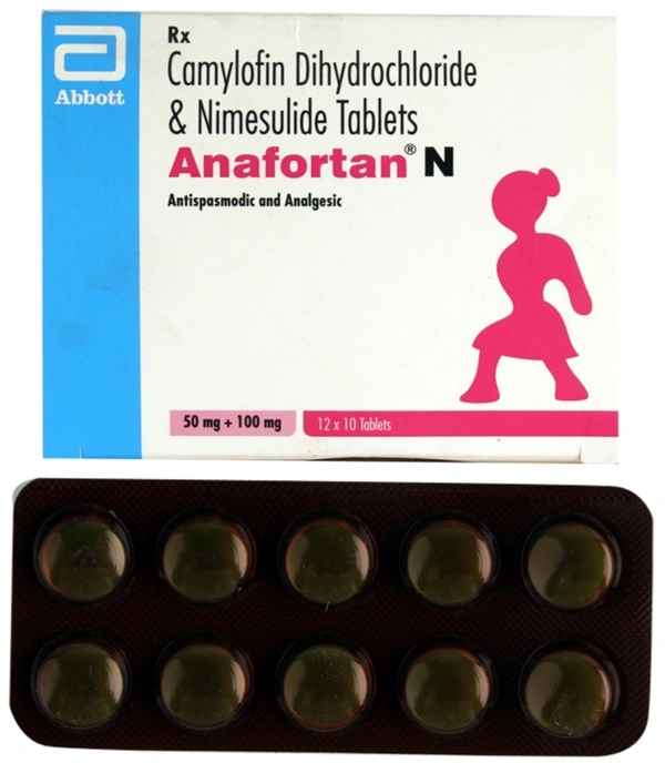Anafortan N 100 mg/50 mg Tablet is a medicine used in the treatment of abdominal cramps. It relaxes the muscles in the stomach or intestine and stops sudden muscle contractions, thereby relieving cramps, pain, bloating, and discomfort.