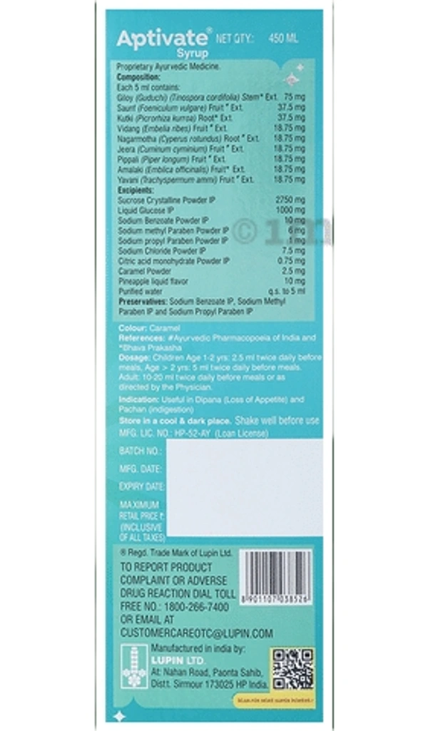 - lthy immune status and digestive systemLupin APTIVATE is commonly used for the diagnosis or treatment of stimulating appetite, promotes digestion, relieves congestion, destroys intestinal worms, intestinal gas.