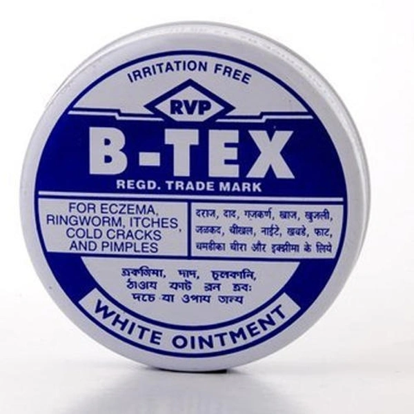 RVP B-Tex Ointment is a powerful ayurvedic combination of germicidal, bactericidal, eschorotic, antiseptic, anesthetic and anti pruritic. It is useful for eczema, ringworm, itching, cold cracks and pimples.
