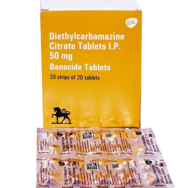 Banocide 50mg Tablet belongs to a class of medication called anti-helminthic. It is used in the treatment of worm infections and filariasis. It can act against both the larval and adult forms of the parasitic worms that cause filariasis.