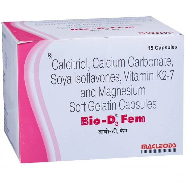 Bio D3 Fem Capsule is a combination of Calcitriol, Calcium carbonate, magnesium, Soy isoflavones, and Vitamin K2-7. Bio D3 Fem is customized therapy for preventing bone loss in peri and postmenopausal women. Calcium Carbonate is important for healthy bones and muscles. If there is not enough calcium in the blood, then the body will take calcium from bones, thereby weakening bones. Thus intake of Calcium is necessary to keep the bones strong. It increases bone strength and also reduces the chance of falls and fractures.