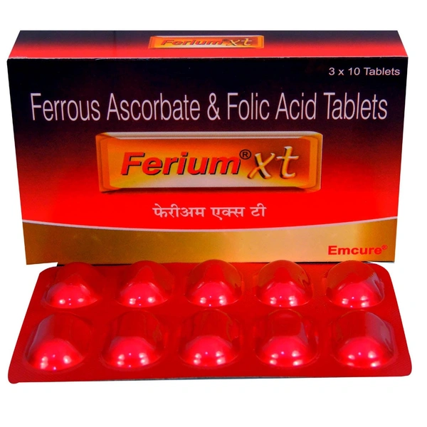 Ferium XT Tablet is helpful in fulfilling the body's iron and vitamin B9 requirements. The tablet helps maintain the proper supply of oxygen by supporting red blood cells and platelet production. This tablet contains iron in the form of ferrous ascorbate, which helps in the quick absorption of folic acid, which is essential to maintain numerous bodily functions in both children and adults. Folic acid is required by our body to produce healthy red blood cells and prevent anaemia.