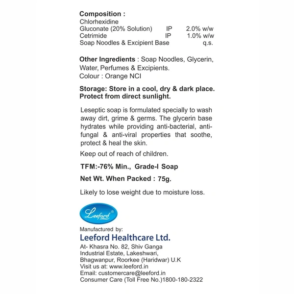 Leseptic Antiseptic Soap is a highly effective soap that eradicates 99.9% germs. It prevents infections and makes a defensive shield for your family. The soap is enriched with moisturizers that give you soft, smooth and healthy skin. Its regular use kills germs and helps in protecting you and your family from illness and infections. It is a dual-purpose antiseptic soap used for hand disinfection and antiseptic baths. Leseptic soap makes your home healthy by preventing infections and offers complete protection to you and your family.