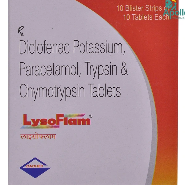 Lysoflam Tablet is a combination of medicines that is used for short term relief of pain, inflammation and swelling. It inhibits the release of those chemical messengers in the brain that tell us that we have pain. It effectively relieves back pain, earache, throat pain, toothache, periods pain and pain due to arthritis too.