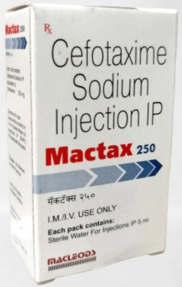 Mactax 250mg Injection is an antibiotic medicine used to treat bacterial infections in your body. It is effective in infections of the brain, lungs, ear, urinary tract, skin and soft tissues, bones and joints, blood, and heart. It is also used to prevent infections during surgery.