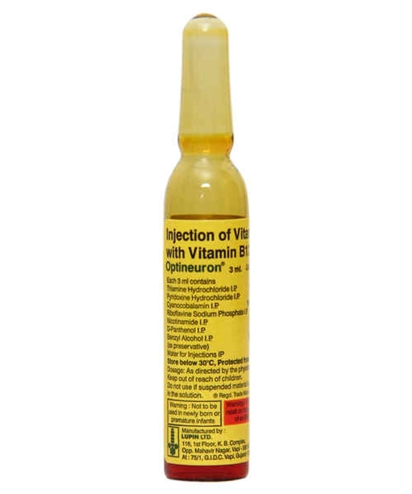 Optineuron Injection is a nutritional supplement that is used with other medicines in the treatment of many long term diseases. Optineuron Injection is given as an injection by a doctor or nurse. It contains various vitamins that help in proper brain function, boosting body energy levels and are important for proper functioning of the nervous system. Optineuron Injection also helps in the formation of red blood cells and enhances the absorption of iron in the body. It also helps in maintaining a healthy skin. Take it in the exact dose and duration as prescribed by your doctor for maximum benefits.