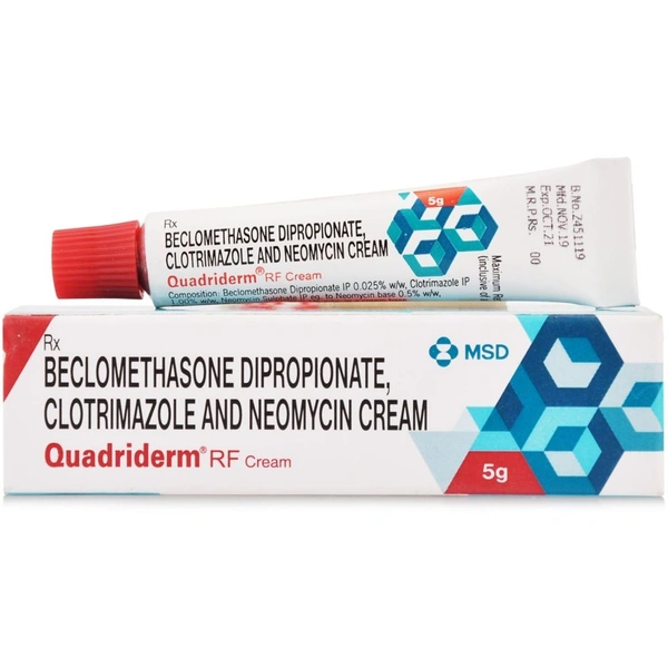 Quadriderm RF Cream is a combination medicine that is used to treat various types of skin infections. It minimizes symptoms of inflammation such as redness, swelling, and itching. It also has antimicrobial action against infection-causing microorganisms.