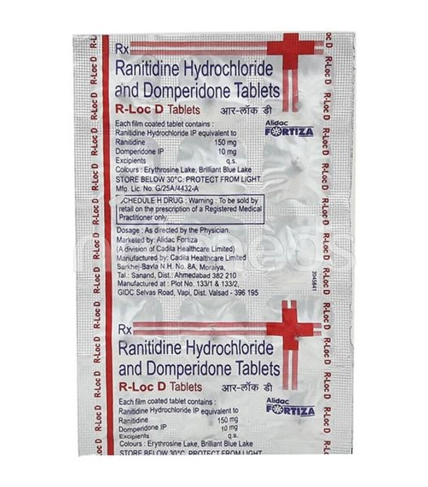 R Loc D 10mg/150mg Tablet is a prescription medicine. It is used to treat gastroesophageal reflux disease (Acid reflux) and peptic ulcer disease. It relieves heartburn, stomach pain or irritation, and indigestion. It promotes the movement of food in the stomach to prevent nausea or vomiting.